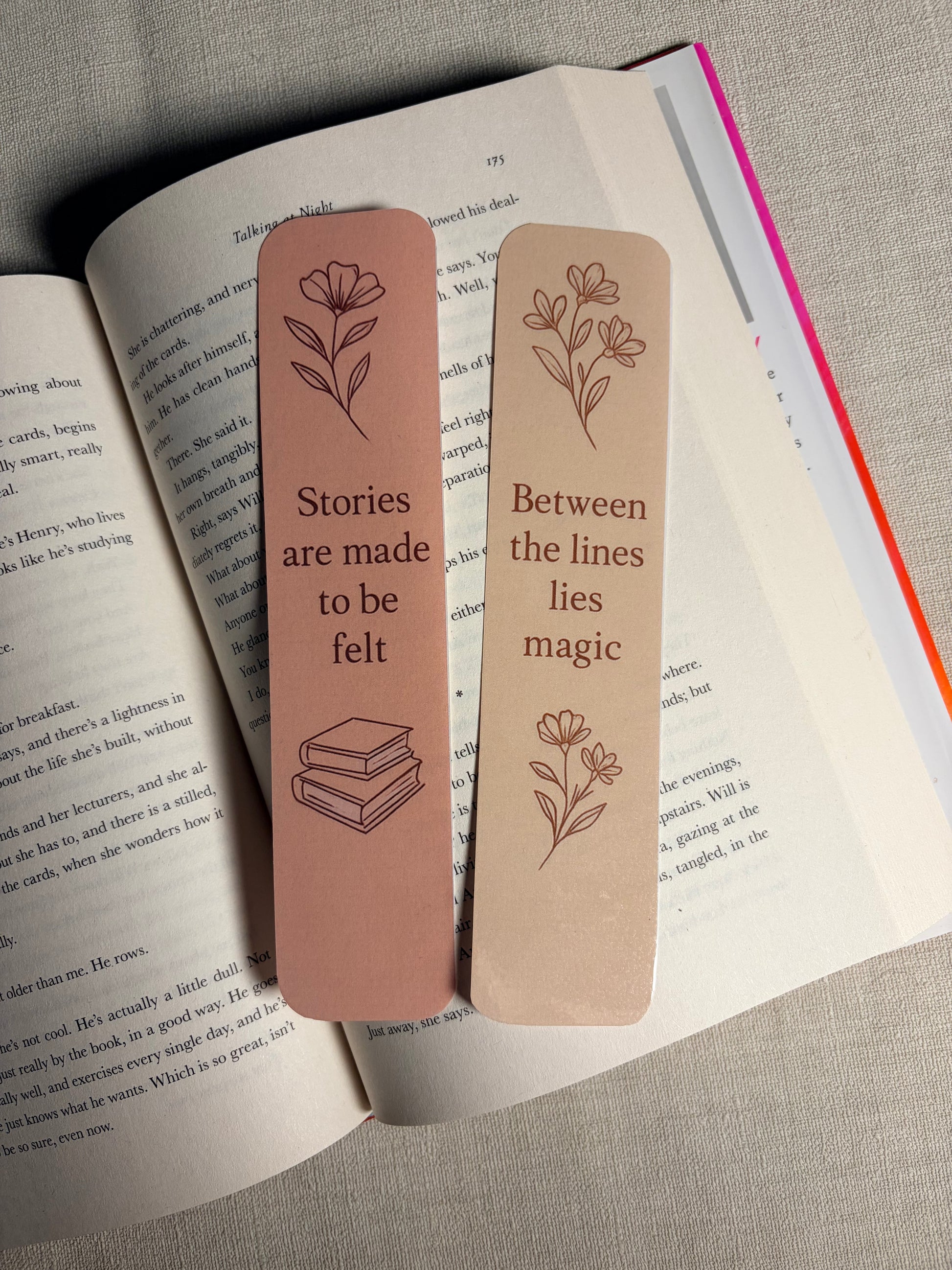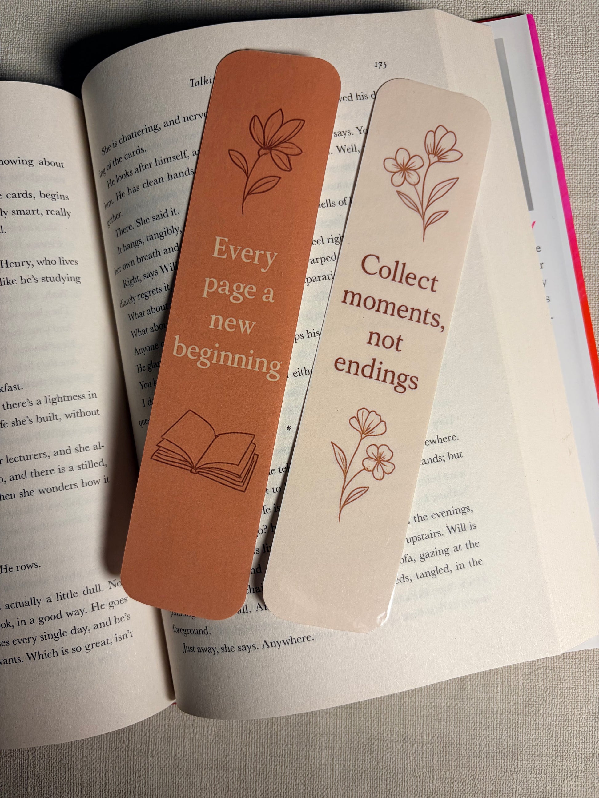 Een elegante collectie van vier boekenleggers in zachte aardetinten, versierd met subtiele bloemillustraties en inspirerende quotes over groei, verhalen en nieuwe beginnen.