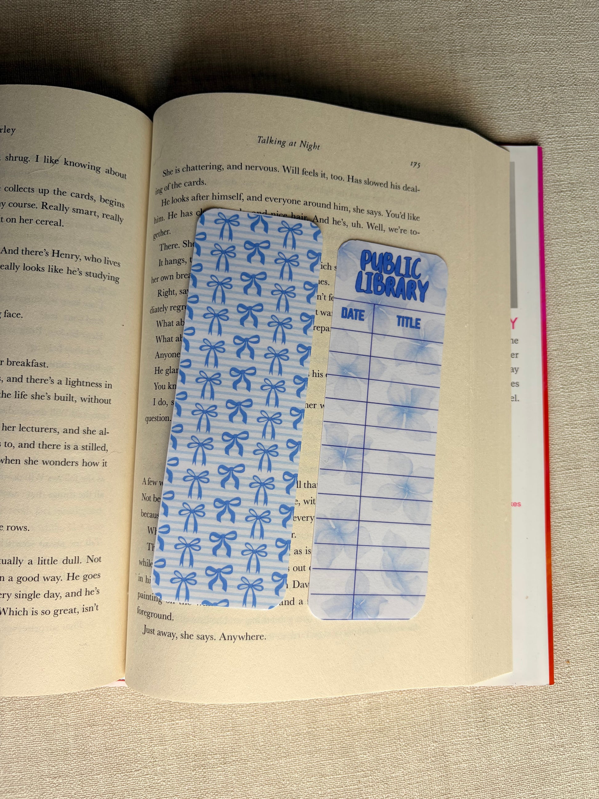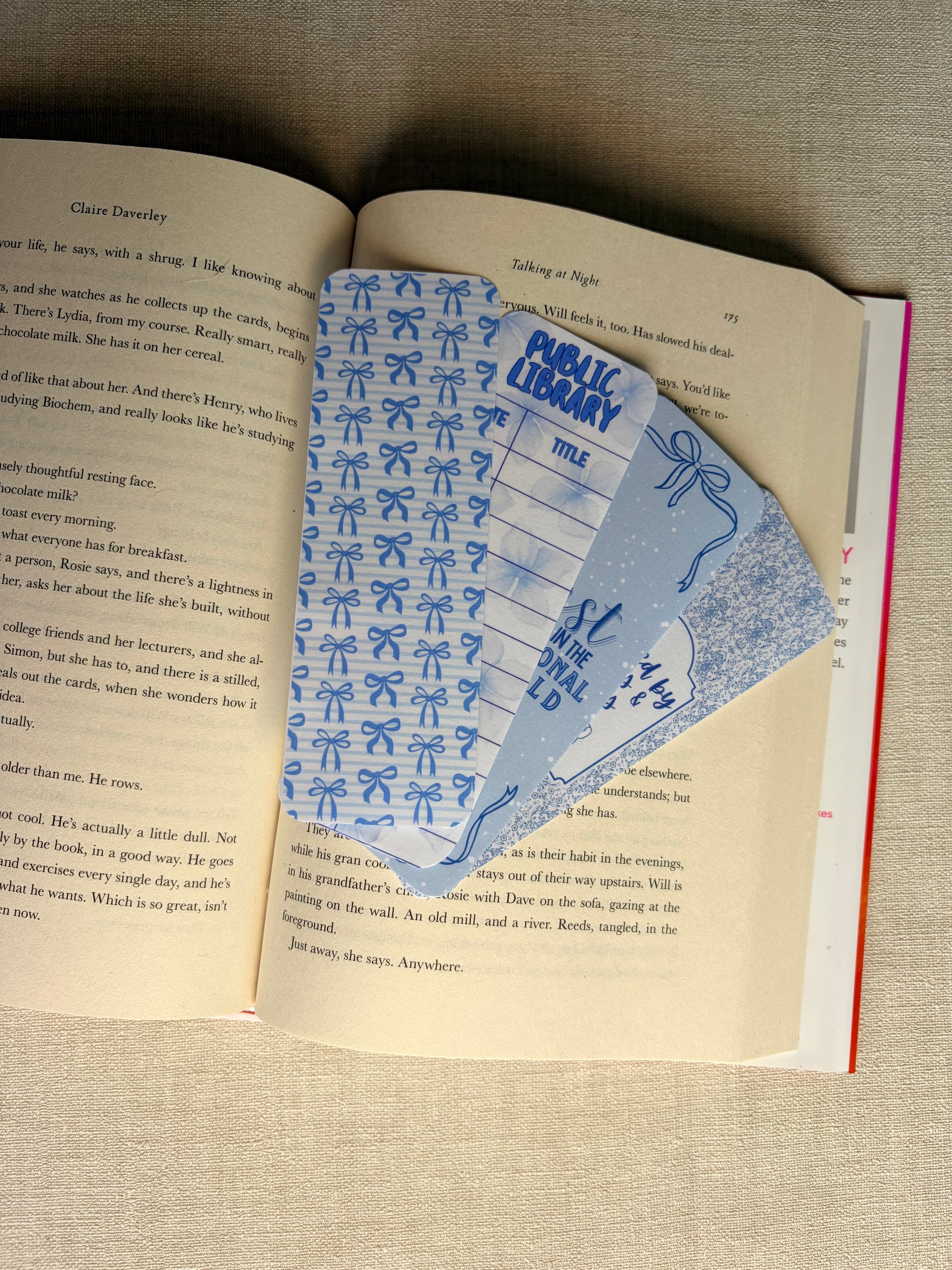De Blue Linen Library set brengt strikjes, zachte lijnen en een vintage library-card look samen in een kalme, cozy pastelblauwe sfeer.