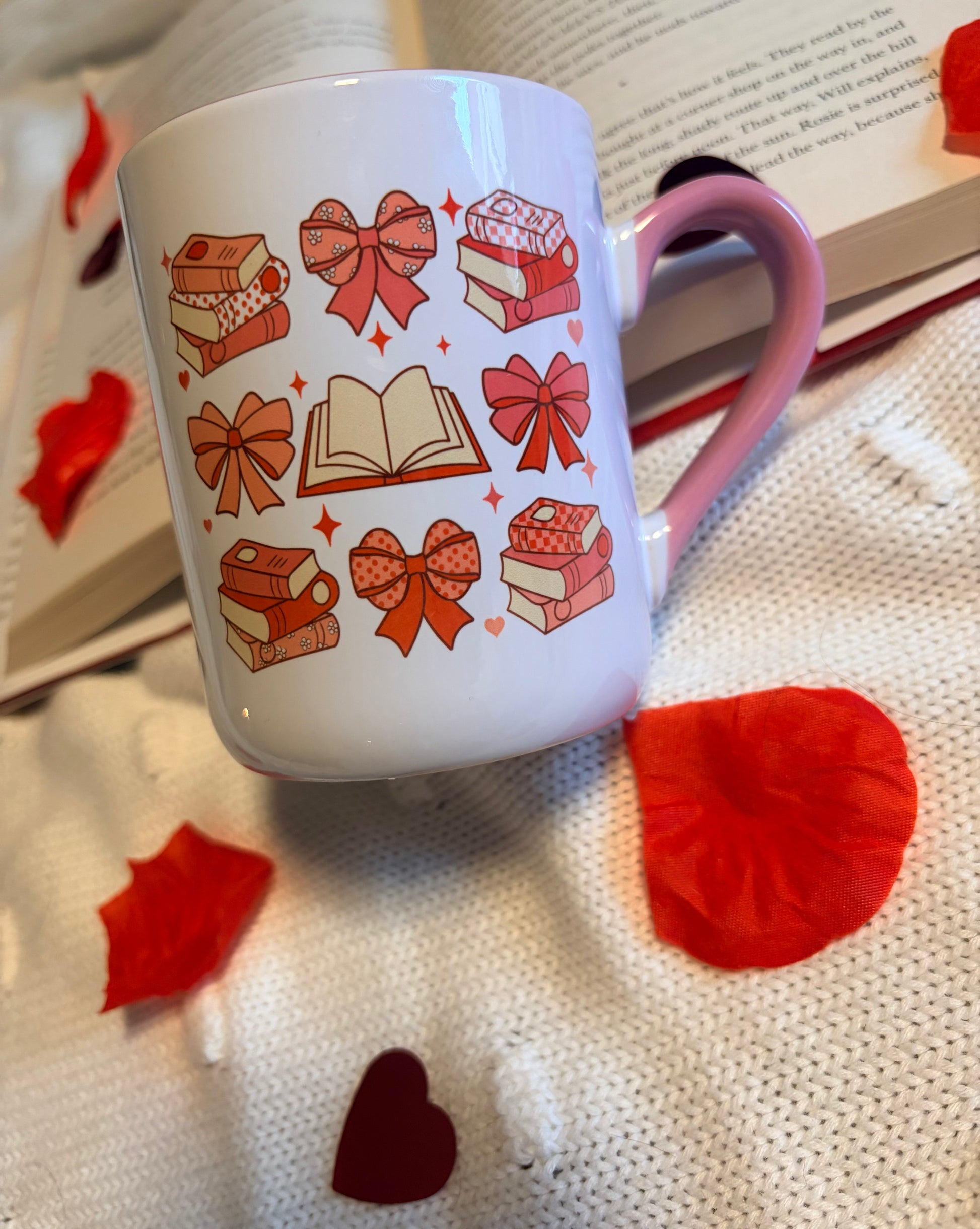 Maak van jouw leesmoment een écht verwenmoment met deze books and bows mok. De mok is gevuld met schattige boekige illustraties in roze tinten en heeft een zachte, romantische uitstraling die perfect past bij cozy avonden op de bank.