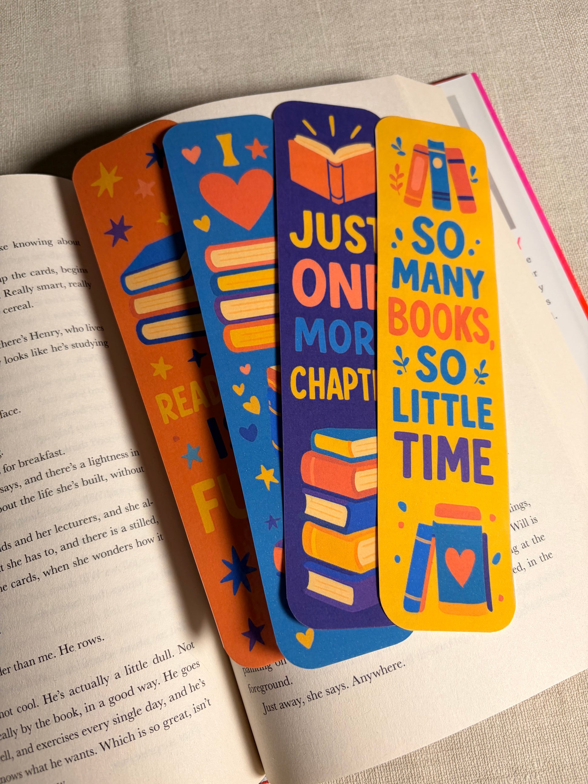 Een levendige collectie van vier boekenleggers vol felle tinten, speelse illustraties en herkenbare quotes voor iedereen die leeft voor boeken.