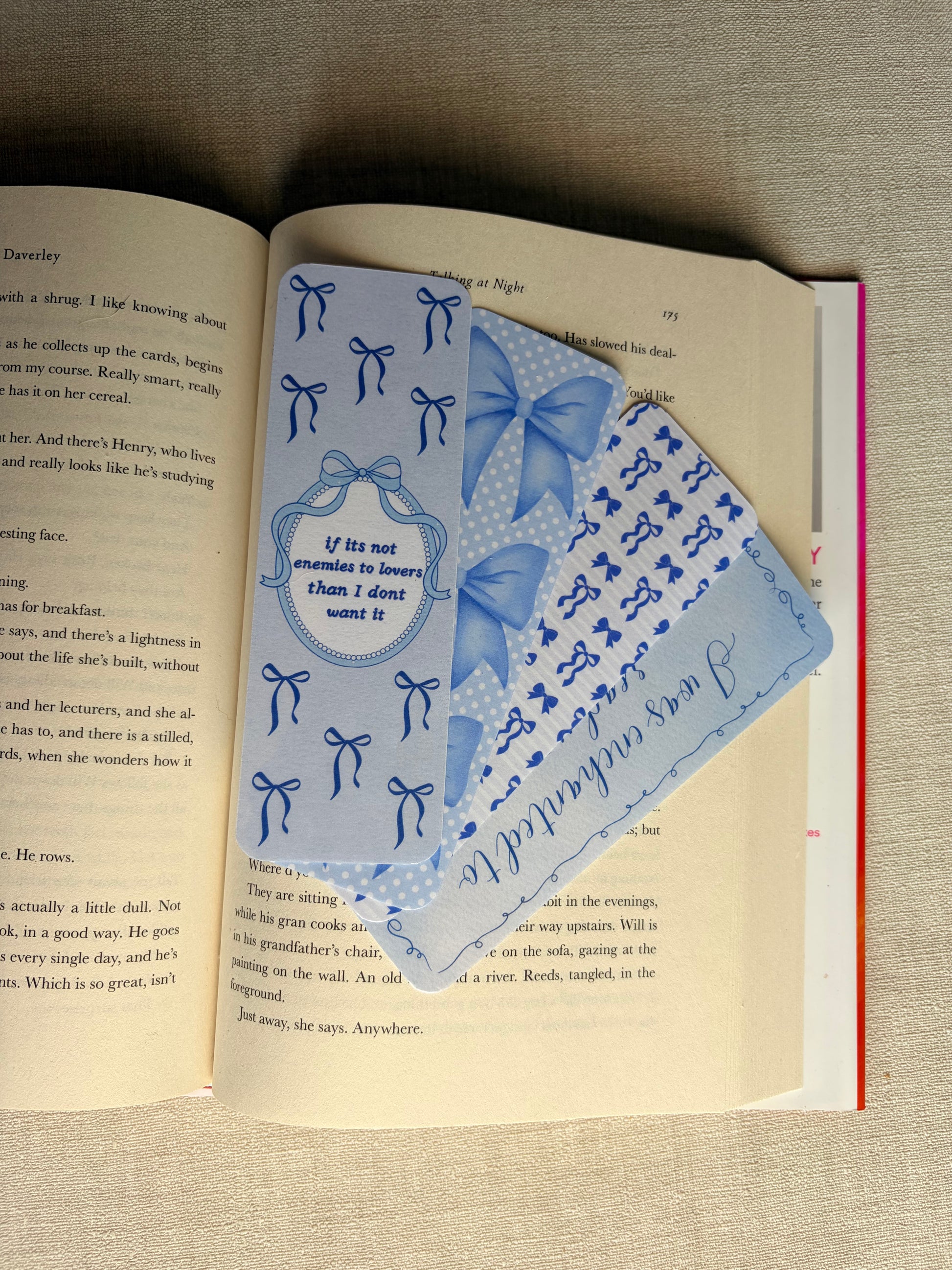 Met zachte blauwe tinten, schattige strikjes en subtiele patronen brengt deze set een coquette aesthetic die perfect past bij jouw lievelingsromans.
