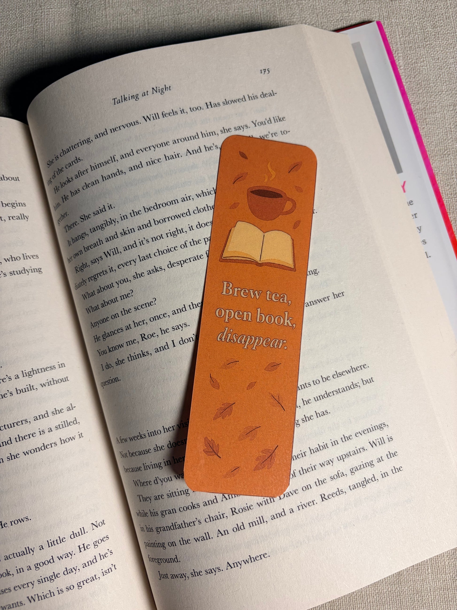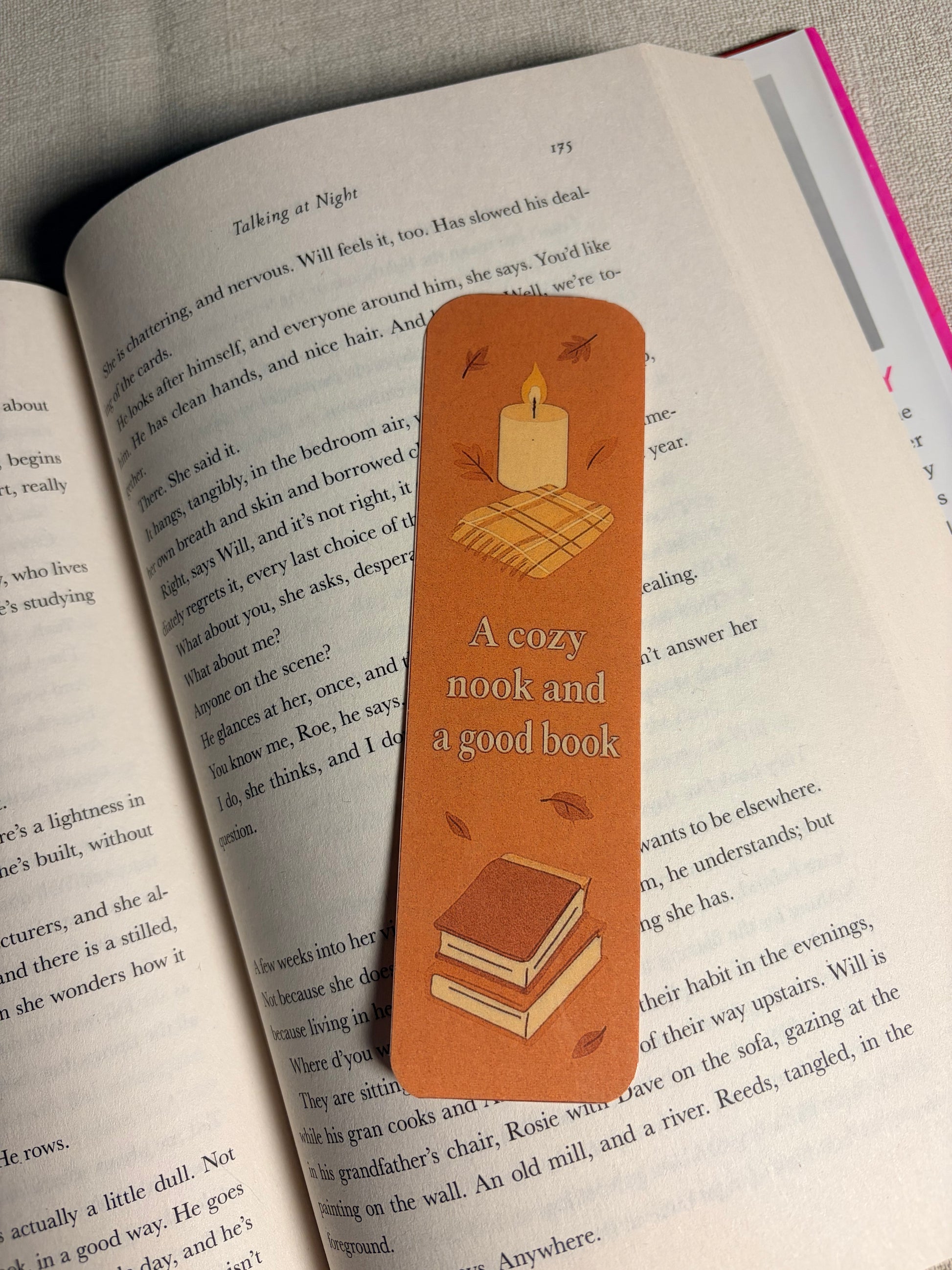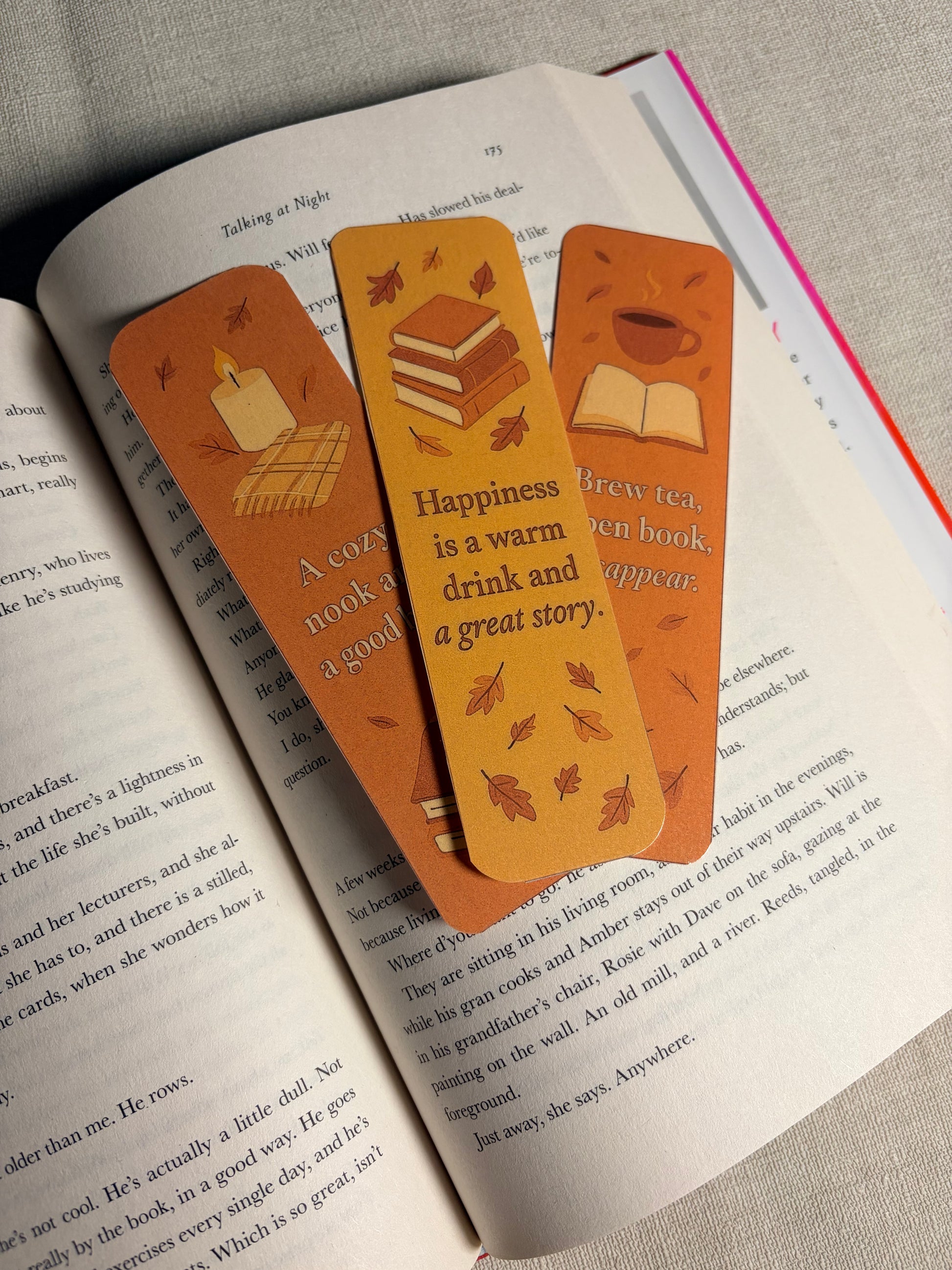 Een knusse collectie van drie boekenleggers in warme bruintinten, met illustraties van kaarsen, thee en vallende bladeren. Perfect voor lezers die houden van rustige avonden, de geur van herfst en de magie van een goed verhaal.