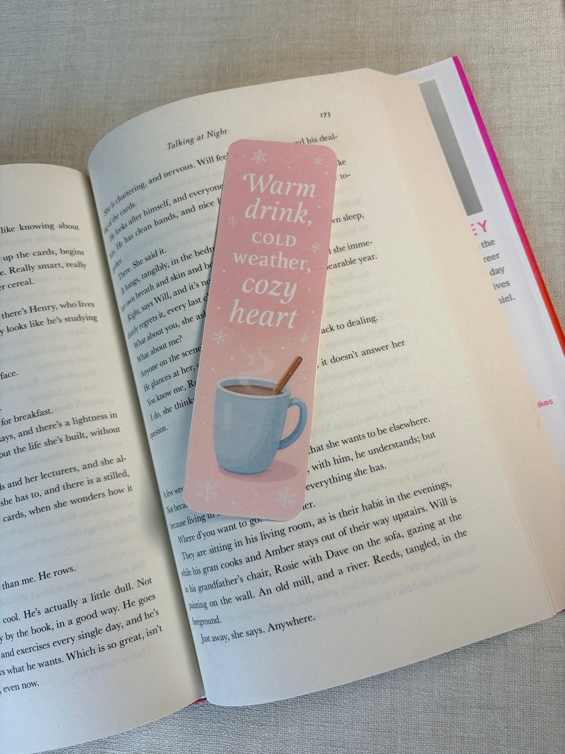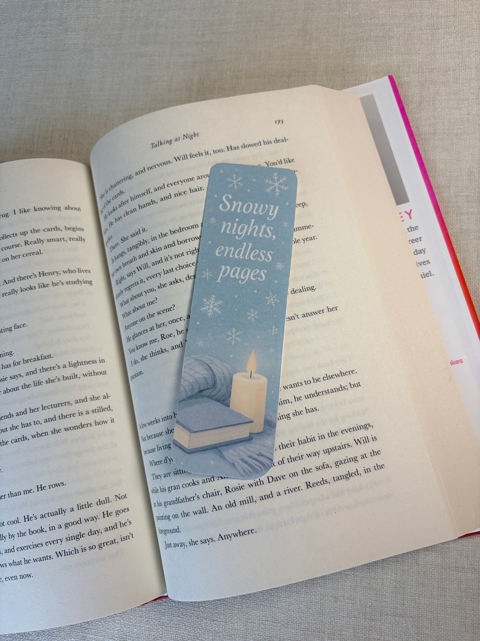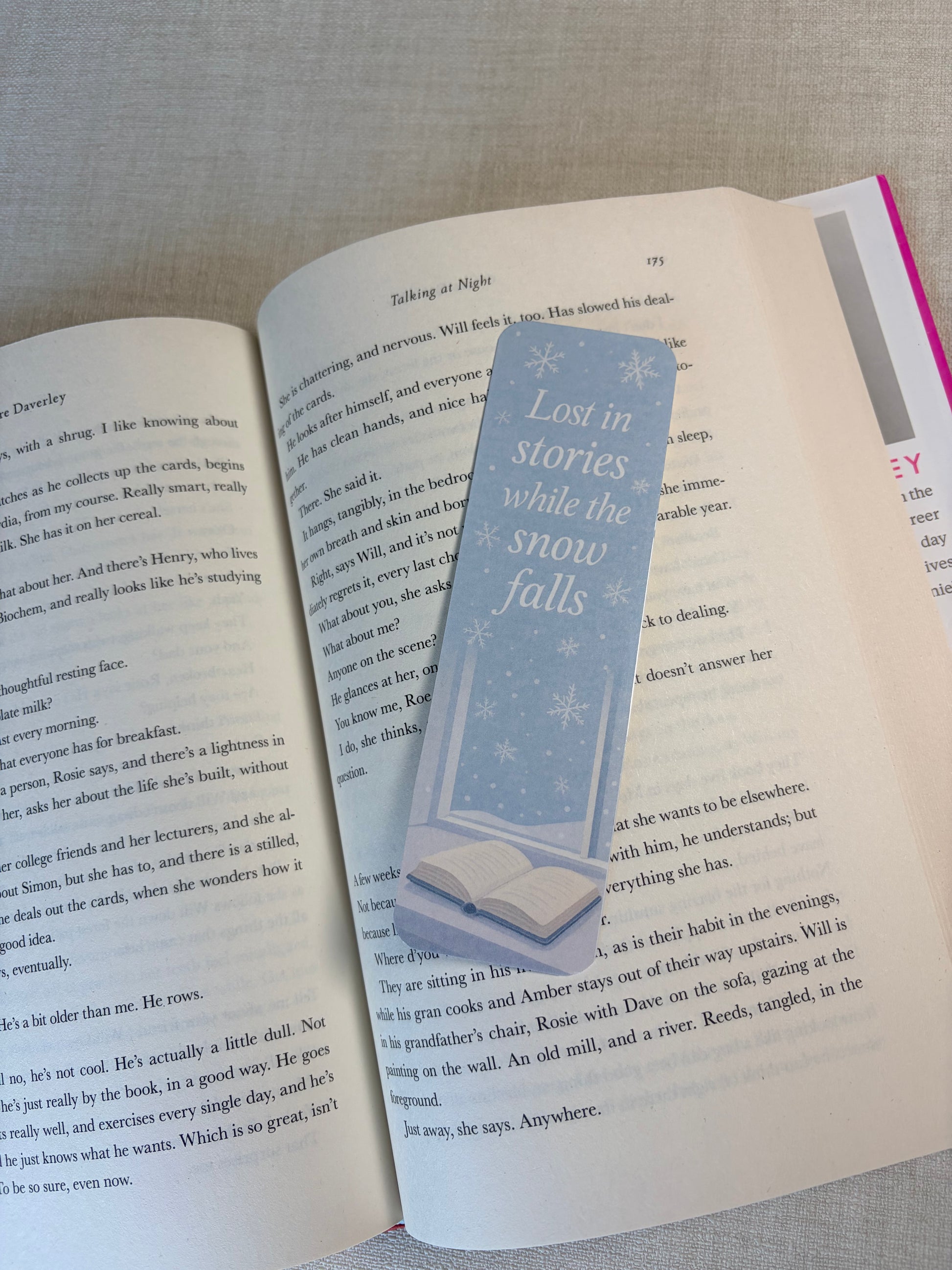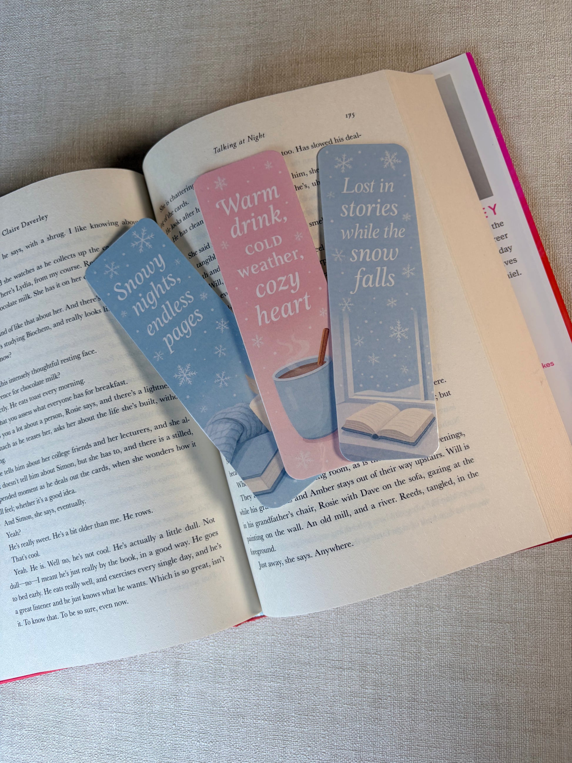 Een betoverende set van drie handgemaakte boekenleggers in zachte wintertinten, met subtiele sneeuwvlokken en cozy quotes die elke leessessie een stukje magischer maken.