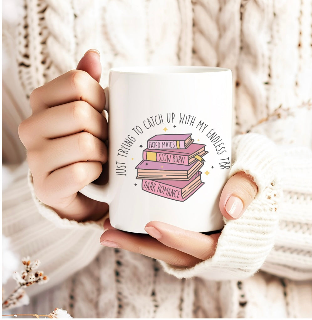 Deze mok met de tekst “Just trying to catch up with my endless TBR” en een stapel boeken met fated mates, slow burn en dark romance is perfect voor lezers die altijd “nog één boek” toevoegen aan hun lijst. Ideaal voor je leesmoment met een warm drankje terwijl je probeert je TBR een beetje in te halen (spoiler: dat lukt nooit 😉).