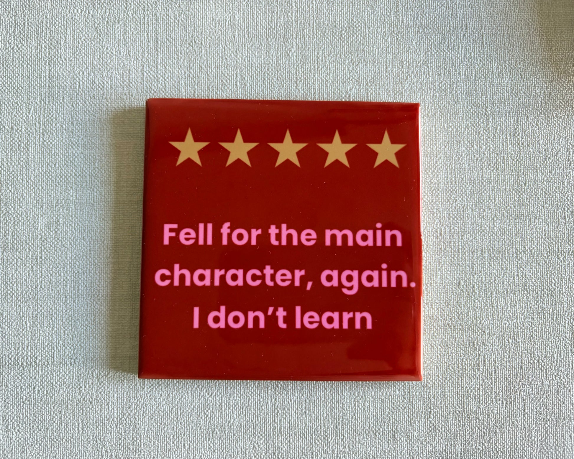 Dit 11x11 cm tegeltje is een must-have voor elke romantische lezer (en BookTok addict). Met de dieprode achtergrond, vijf sterren en de quote “Fell for the main character, again. I don’t learn” is het de perfecte knipoog naar alle fictieve obsessions waar je maar geen genoeg van krijgt.