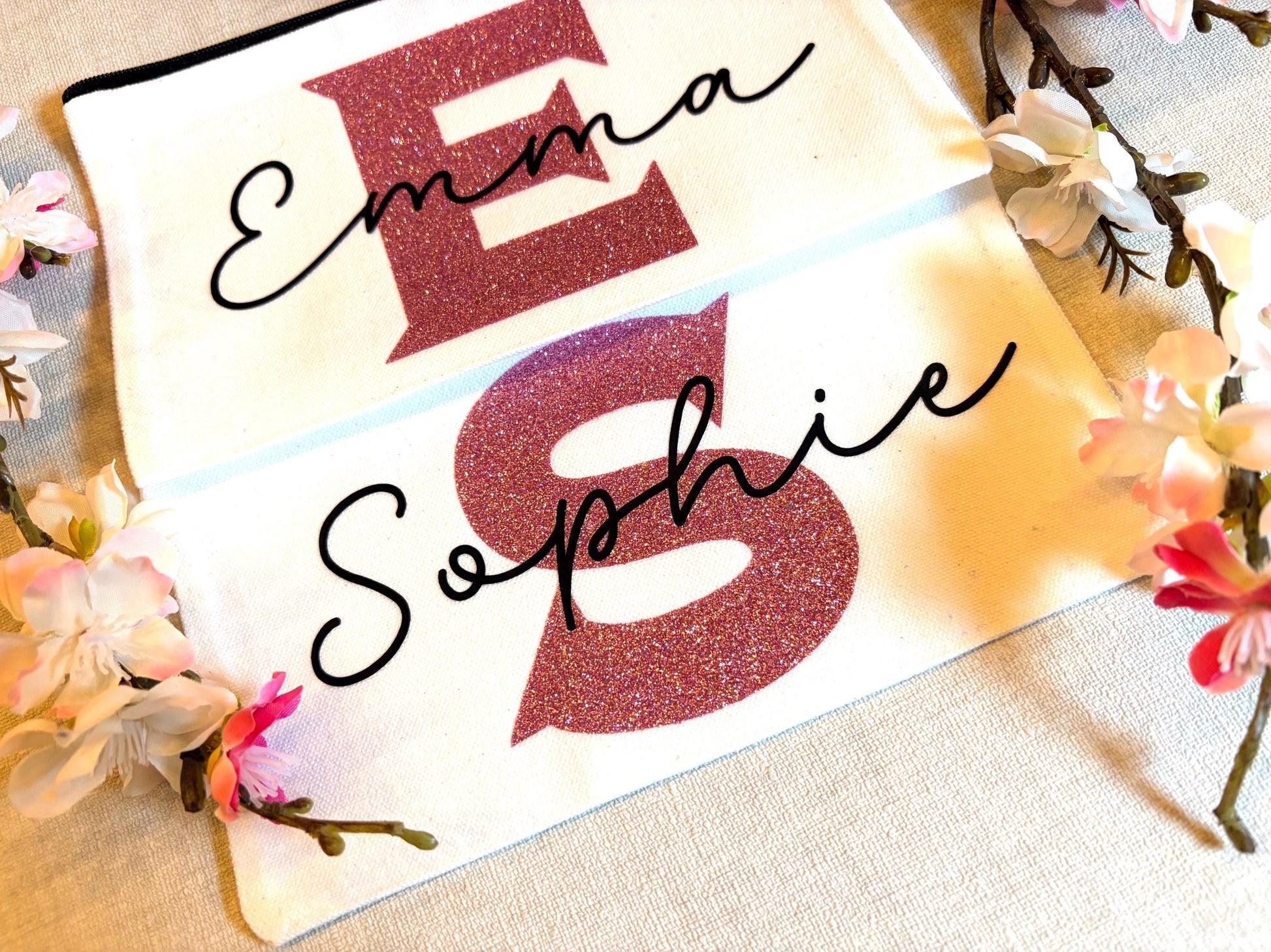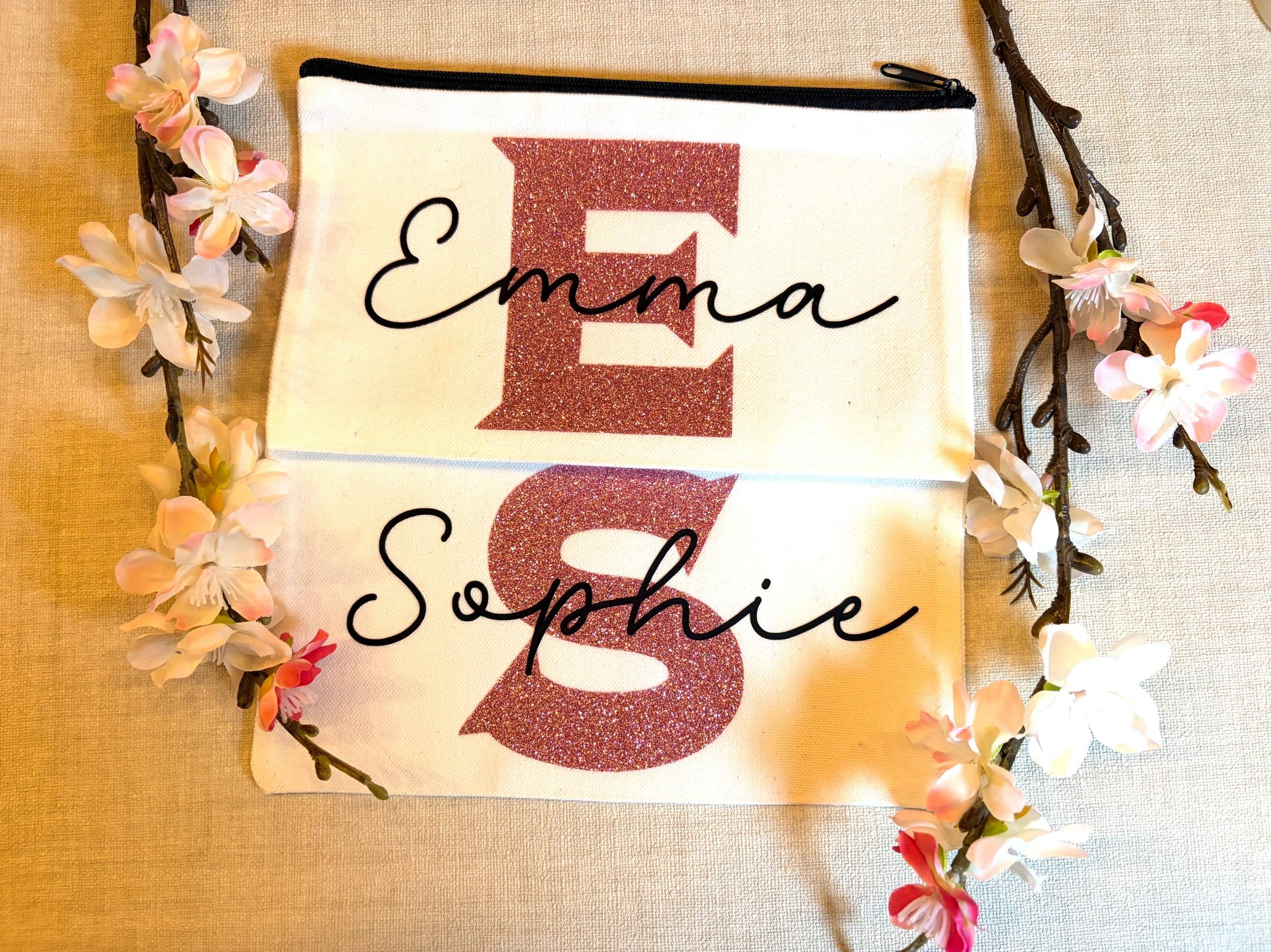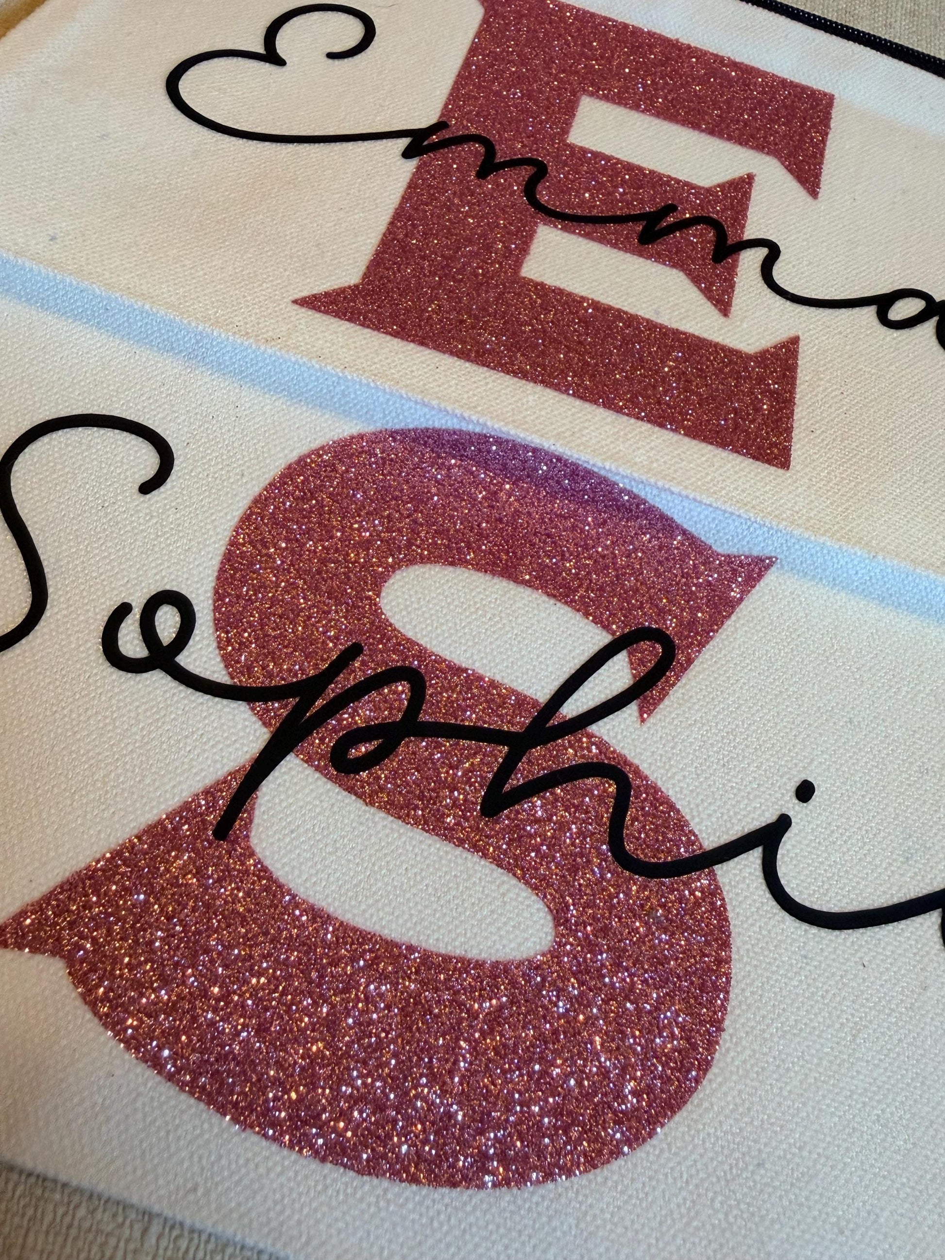 Deze handgemaakte etui heeft een grote glitterinitiaal en sierlijke naam in elegant zwart, perfect voor make-up, schrijfwaren of als cadeau voor iemand die een beetje extra glans verdient. 💕