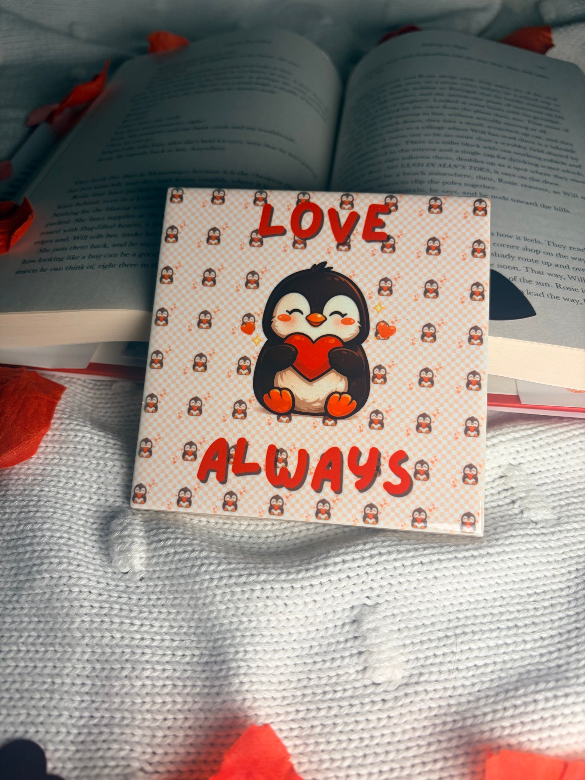 Op zoek naar een tegeltje waar je spontaan blij van wordt? Deze “Love Always” tegel is een echte cutie. In het midden zit een schattige pinguïn met een hartje, en op de achtergrond zie je een subtiele all-over print met mini pinguïns. Dat geeft ‘m nét die extra speelse, unieke look.