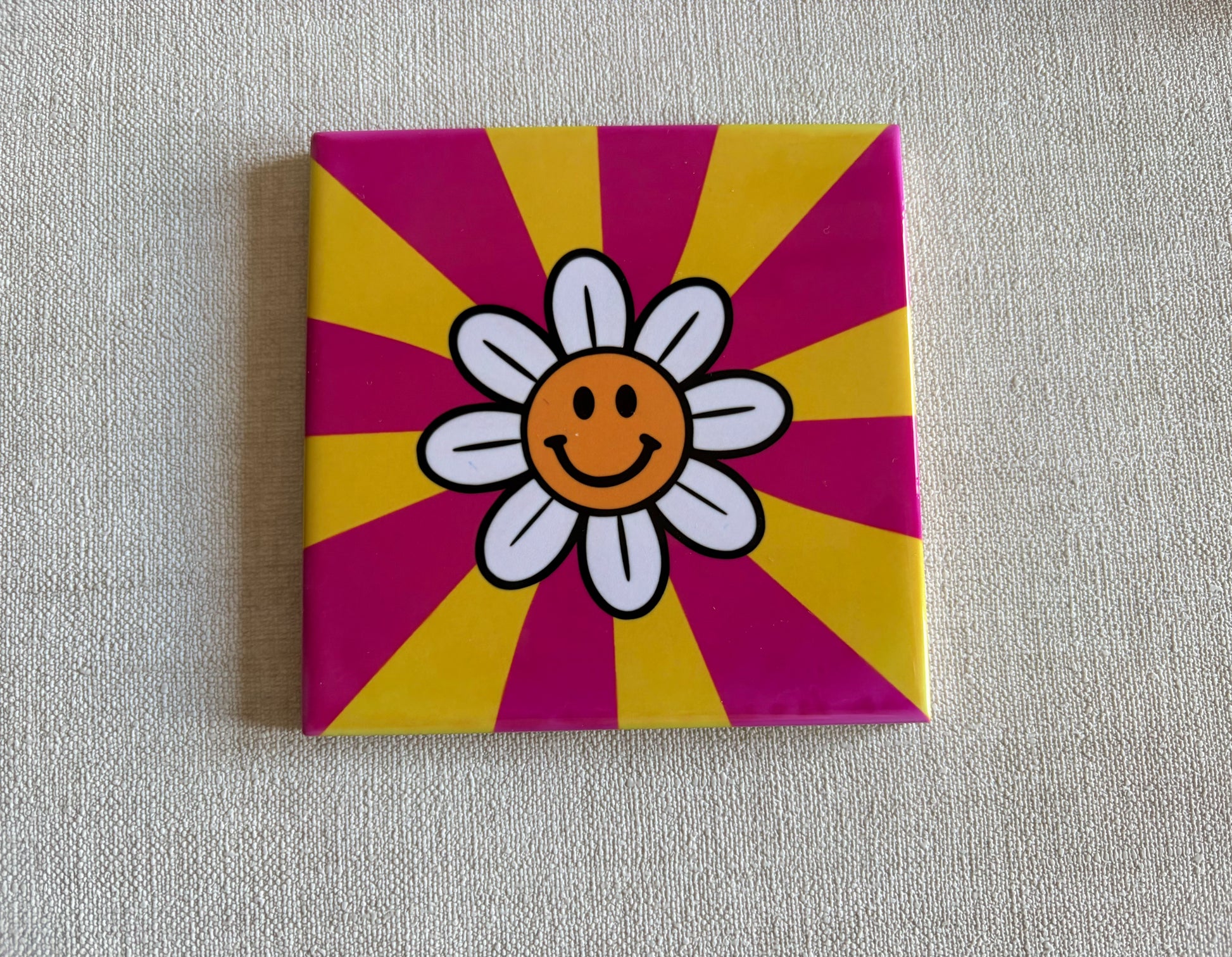 Dit 11x11 cm tegeltje is pure good vibes voor in huis. De felroze en gele stralen geven een echte retro uitstraling, met in het midden een vrolijke smiley-madelief die je elke keer laat glimlachen.
