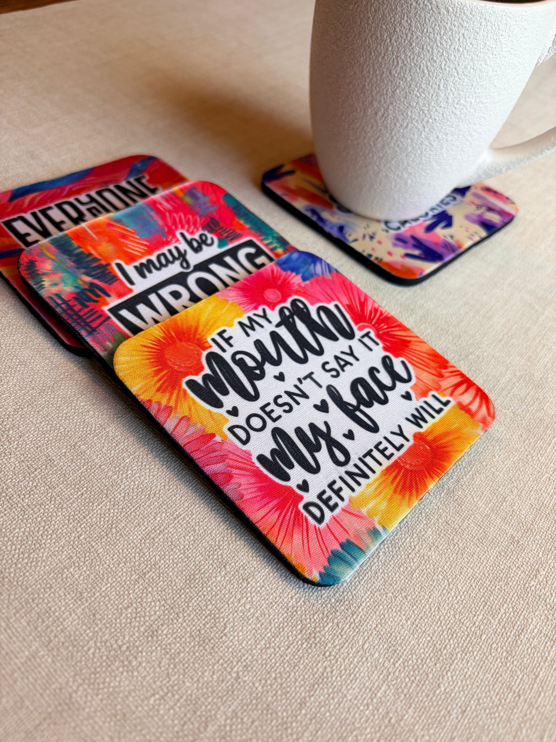 Breng kleur én een flinke knipoog naar je koffietafel! Deze onderzetters met pittige quotes zijn perfect voor iedereen die houdt van humor met een randje. De vrolijke kleuren en speelse typografie maken van elk drankje een mini-statement.