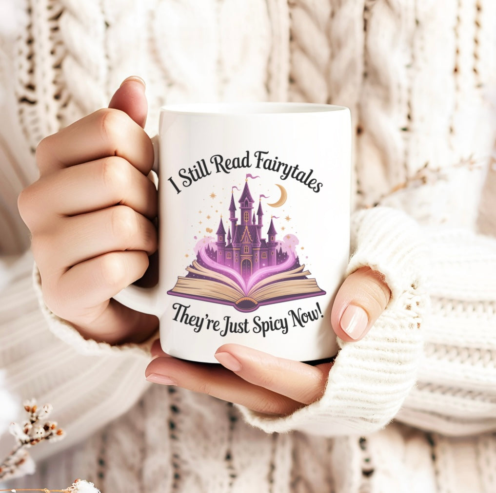 Deze mok met de tekst “I still read fairytales, they’re just spicy now!” is perfect voor fans van romantasy, spice en fae-prinsen die je TBR domineren. Het paarse kasteel dat uit het open boek oplicht geeft meteen die magische, dromerige vibe – ideaal voor je volgende steamy hoofdstuk met een warm drankje erbij.