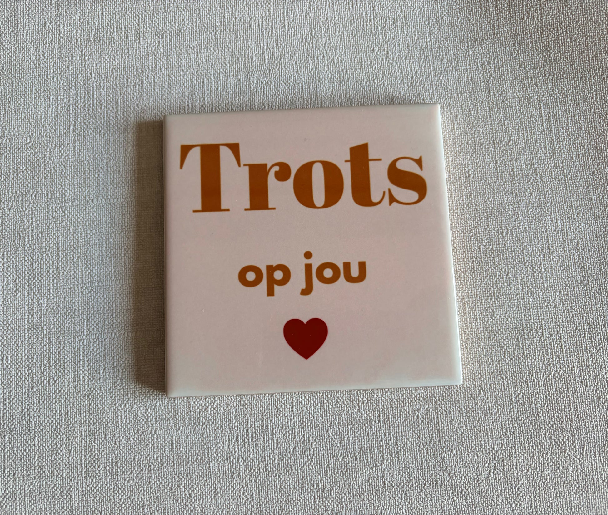 Dit 11x11 cm tegeltje is het perfecte cadeautje om iemand te laten weten hoe enorm trots je op diegene bent. De zachte nude/roze achtergrond, warme okerkleurige tekst “Trots op jou” en het rode hartje maken het stijlvol én liefdevol tegelijk.